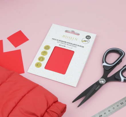 Matériel nécessaire : pièces de réparations, ciseaux et un fer à repasser pour les pièces thermocollantes.